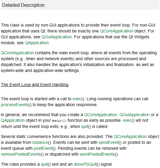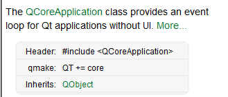 이런 설명을 볼수 있다. 즉 UI가 없이 Qt 애플리케이션의 이벤트 루프를 제공한다라고 되어 있다. 좀더 자세히 보기 위해 More를 클릭해 보자.