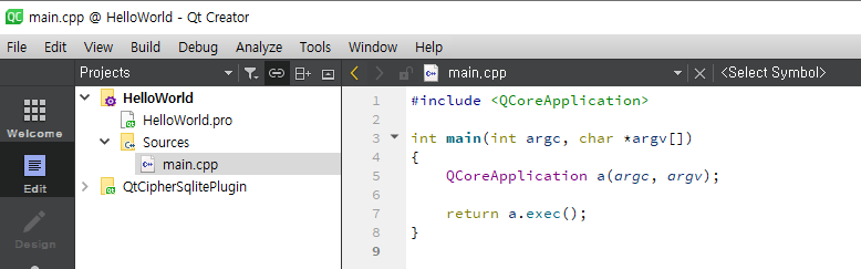 자 드디어 익숙한 소스 코드가 보인다. 개발자라면 무수히 보았을 main.cpp 소스 파일 하나과 뭔지 모를 HelloWorld.pro 파일 하나가 덩그러니 있다.