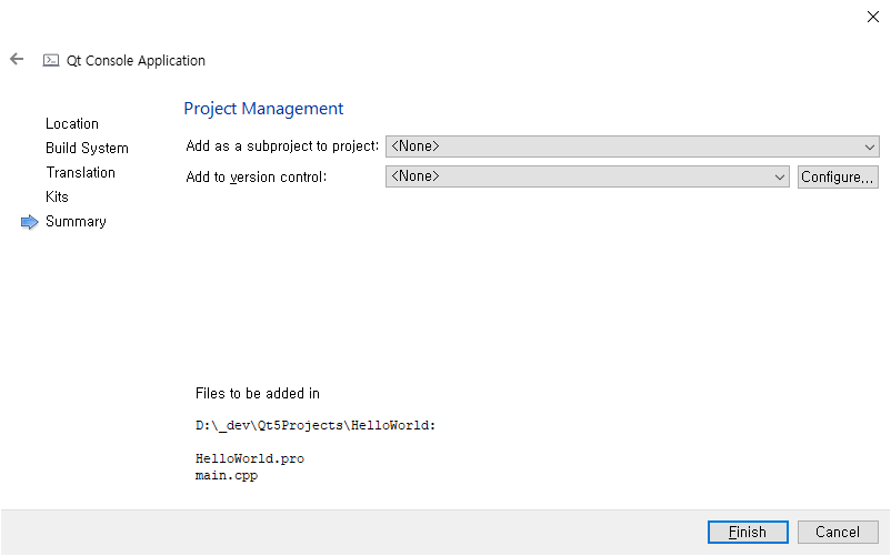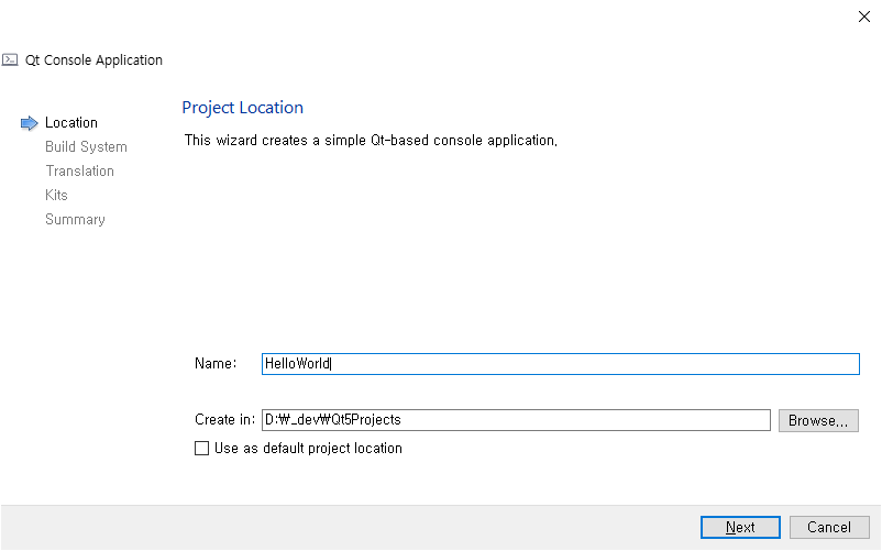 QtCreator를 이용하여 새로운 콘솔 프로젝트를 아래와 같이 생성해 보자. 나는 관행적으로 D드라이브에 _dev라는 폴더를 두고 그 아래에 개발 관련 프로젝트를 모아 놓는다. 편한곳에 생성하면 된다.