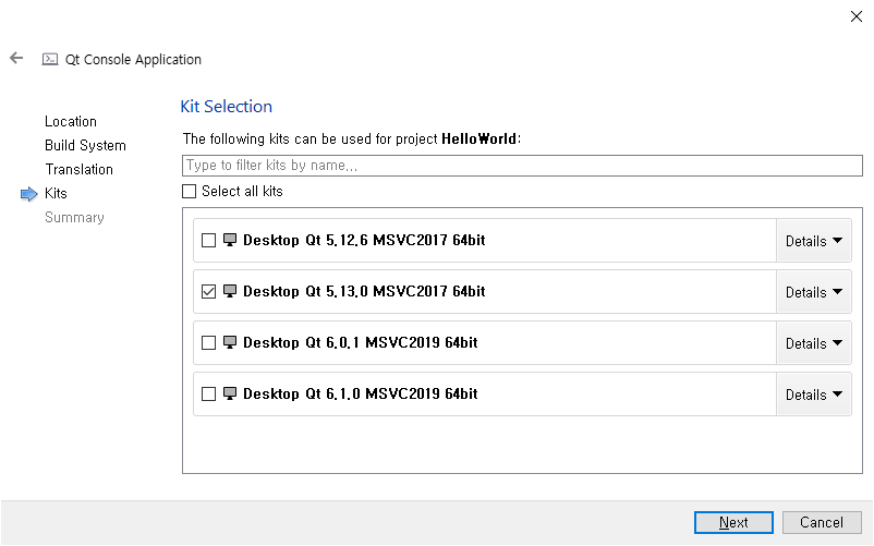 뭔가 더욱더 복잡한게 나왔다. 키트를 선택하란다. 키트란 뭔가? 그동안 대충 다음으로 넘어갔지만 이번 정리를 위해 좀더 찾아 보았다. 키트란 결국 배포하려는 플랫폼을 의미한다. 나는 여러 버전의 Qt를 설치했으므로 많이 나오지만 여러분은 좀 다르게 나올것이다. 적절히 Qt5 버전대를 선택하라.