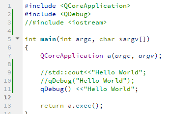 C++방식으로 Hello World를 출력하도록 하고 실행하면 Hello World를 볼 수 있다. 이제 다른 방식은 어떨까. Qt의 기능을 이용할 수 있으면 좋겠는데. 있다. qDebug 를 이용하는 것이다.