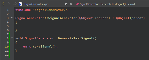 위 소스를 보면 emit란 용어는 처음 볼겠지만 대략 GeneratorTextSignal 함수가 호출되면 내부적으로 textSignal 을 호출함을 알 수 있을 것이다. 사실 위에서 보이는 signals 와 emit은 표준 c++에는 있지 않은 용어다. 즉 qt가 정의한 키워드이며 qt는 c++ 소스 코드에서 해당 키워드를 이용하여 표준 c++에 맞도록 코드를 추가하고 컴파일을 진행한다.