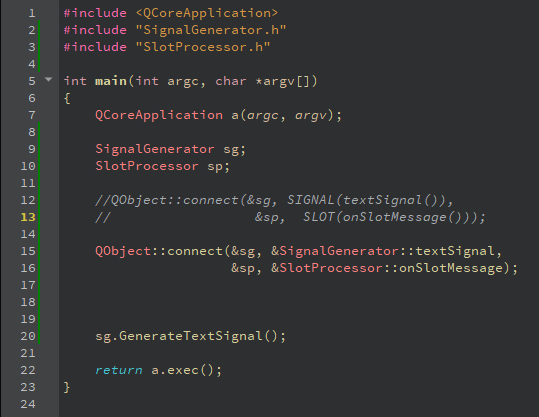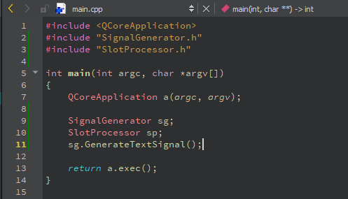 SlotProcessor의 함수를 보면 두 클래스의 의도가 SignalGenerator에서 GeneratorTextSignal을 호출하면 Signal and slot 메커니즘에 따라 SlotProcessor의 onSlotMessage가 호출되기 위한 코드이다. 두 클래스의 인스탄스를 main에서 정의해보자.