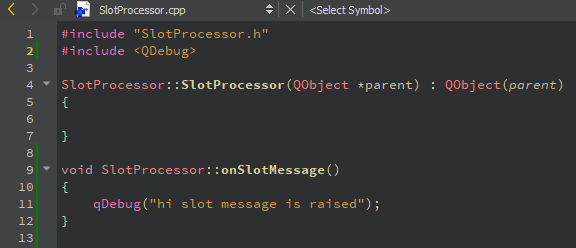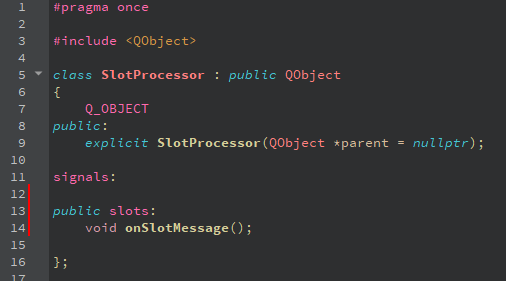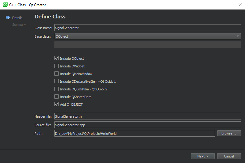 Signal이 발생하는 곳을 SignalGenerator라고 하고, Slot을 처리하는 곳을 SlotProcessor라고 하자. 주의할 점은 Signal and Slot 메커니즘이 작동하기 위해서는 반드시 QObject를 상속받아야 한다. 그 외에 매크로도 추가해야 하지만 Qt Creator는 간편한 위저드 기능을 제공한다.