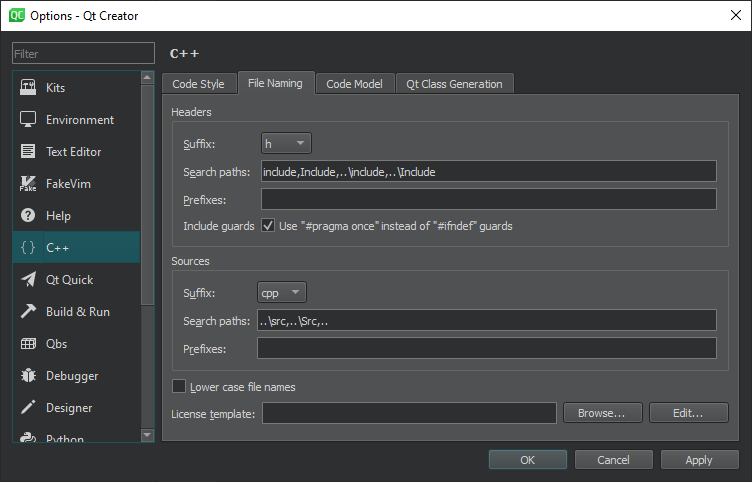 아마 특별한 설정을 하지 않았다면 파일명이 소문자로 표시될 것이다. Qt Creator의 기본값이 소문자여서 그렇다. 아래와 같이 옵션으로 변경할 수 있다.