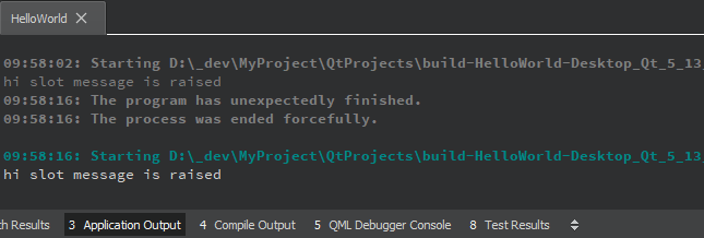Connect 함수를 통해 두 인스탄스를 Signal / Slot을 연결해 주고 나서 실행하면 아래와 같은 텍스트가 출력됨을 Application Out 창을 통해 확인할 수 있다. connect 함수에 F1 을 클릭해서 (더이상 F1을 이야기 하지 않겠다) 설명을 보면 여러가지 버전으로 재정의 되어 있다. 처음에 주석 처리한 방식도 정상적으로 작동된다. 나는 그중에 멤버 함수의 포인터를 이용하여 연결하는 방식을 사용하였다.