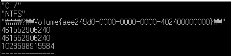 간단히 드라이브의 이름, 포맷 스타일, 장치관리에서 볼수 있는 디바이스 이름과 공간에 대해서 볼 수 있다. 아래를 보면 bytesAvailable() 와 byteFree()가 동일 공간으로 나온다. 아마 윈도우 계열을 사용자는 어느것을 사용해도 같을 것이지만 리눅스 같은 경우 현재 사용자별도 별도의 공간을 할당할 수 있는 경우는 좀 달라진다.