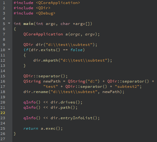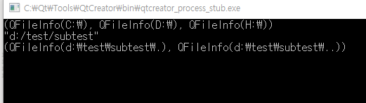 샘플코드로 설명을 하자면 QDir을 이용하여 D드라이브에서 Test\\subtest 폴더가 있는지 확인하고 없으면 생성한 뒤 이름을 바꾸는 것이다. 추가적으로 PC에 연결된 드라이브 목록과 경로 특정 폴더안에 있는 파일 리스트도 얻을 수 있다.