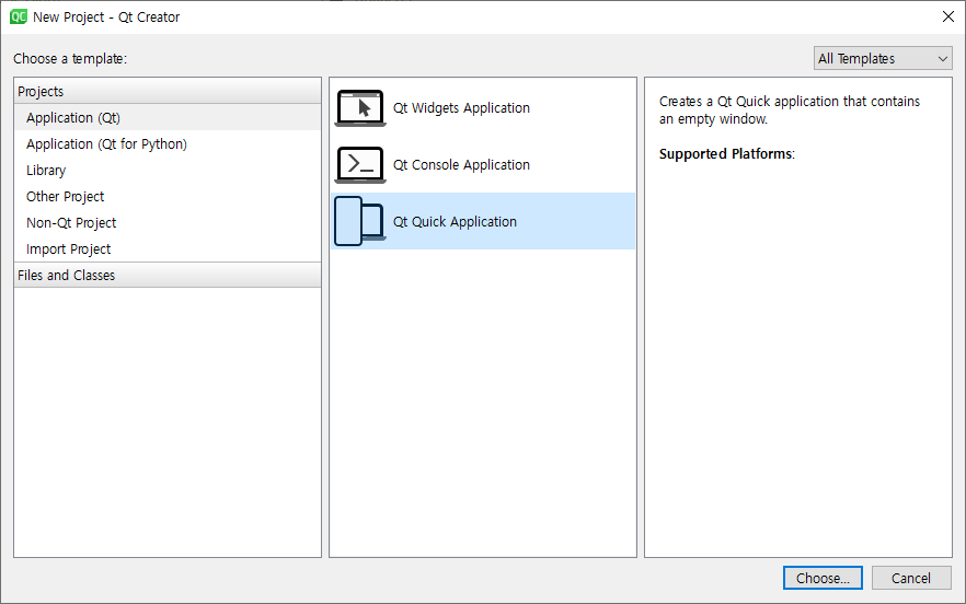 QT Creator 6 에서 새로운 프로젝트는 QT5에 비해 단촐해졌다. 아래 메뉴를 통해 새로운 프로젝트를 생성하자.