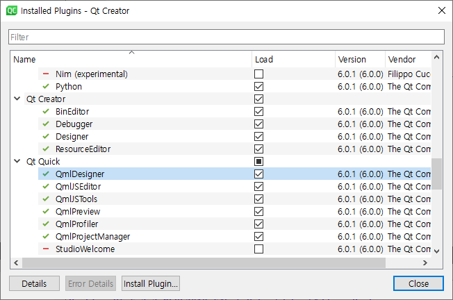 여러분은 마치 키보드나 콘트롤을 드래깅하여 화면이 디자인 되는 것을 보고 싶다면 현재 화면 왼쪽으니 Edit탭을 Design 탭으로 변경해야 한다. edit화면에서 qml 코드를 보여주면 design tab도 활성화 되지만 괴상하게도 Qt Creator 6부터는 Design 탭이 기본적으로 비활성화 되어 있다. 활성화 하기 위해서 메뉴의 help -> about plugin 에서 QmlDesigner를 선택해 주어야 한다.