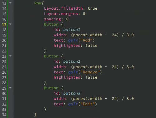 즉 상위 component인 row의 넓이를 가져와 1/3 을 계산하여 button의 width 로 정해겠다는 것이다. 하는 김에 row의 속성인 spacing 에 값을 할당하여 버튼 사이가 입력 값만큼 여유가 생기고 Layout.margins으로 외곽선 부분에 여유 공간을 할당한다.