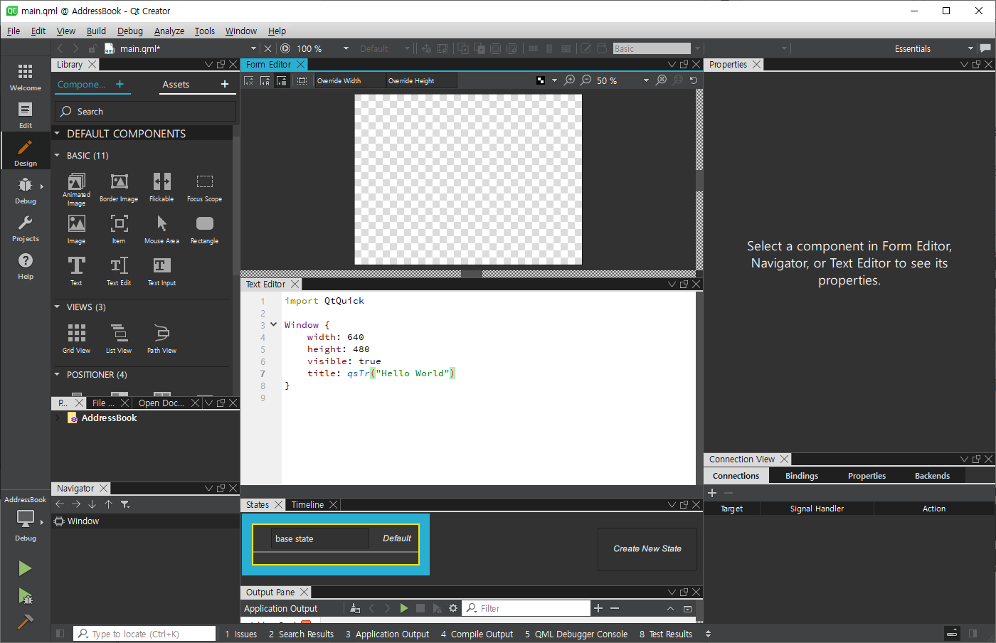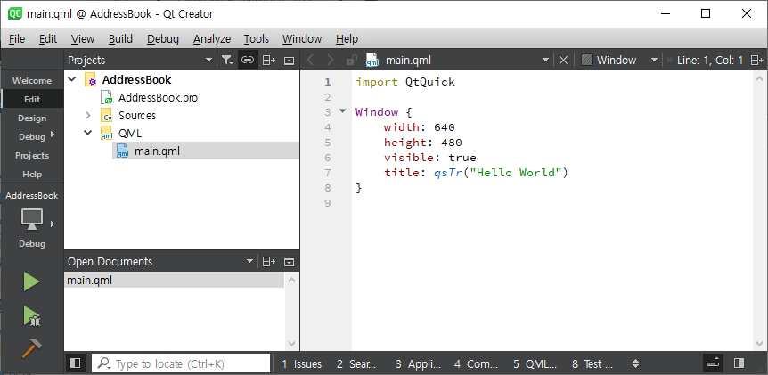 모든 c/c++프로그램은 main 함수가 entry point 이다. 여기서 GUI출력을 위한 Application entry 포인트인 QGuiApplication이 선언되어 있다. 이것이 UI를 위한 프레임원을 위한 전역 객체 되시겠다. QML 코드를 해석해서 화면에 표시하기 위한 QQmlApplicationEngine이 선언되어 있다. 그리고 engine이 main.qml을 로딩하고 app 이 실행되면 main.qml이 화면에 표시된다. 다시 화면 디자인으로 돌아가자.