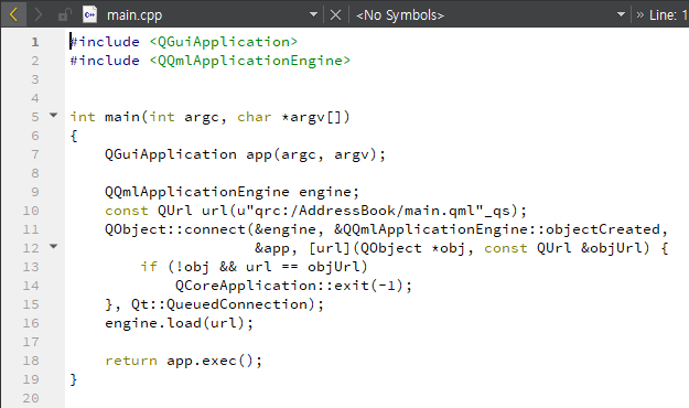 디자인된 QML 화면은 아래와 같이 main 함수를 통해 c++과 연계된다.