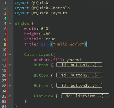 먼저 ColumnLayout을 통해 화면을 상하로 2분할 한뒤 위쪽에 버튼 세개, 아래쪽에 리스트뷰를 배치해보자. QML은 콤포넌트 안에 콤포너트를 넣어 재귀적으로 관리할 수 있으니 ColumnLayout {} 추가해서 모든 버튼과 ListView를 ListView 의 양 괄호 안에 넣자. 이걸 하기 전에 QML에 import QtQuick.Layouts 를 추가하여 Layout을 쓴다고 선언해 주어야 한다.