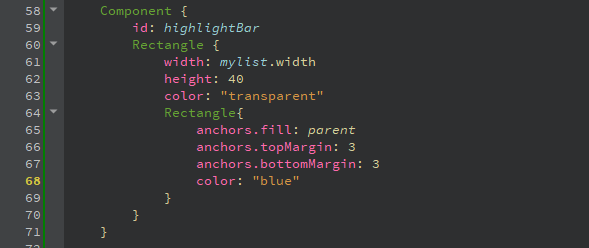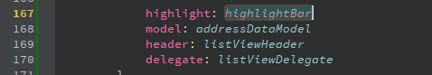 그리고 ListView에 highlight를 추가하여 Component 를 연결한다. 하지만 실행해 보면 예상처럼 작동되지 않는다. highlight 는 ListView가 가지고 있는 currentIndex 의 값이 변경될때 작동된다. 이제 MouseArea 에 Click이벤트를 추가하여 클릭시 인덱스를 변경해보자. 여기서 원래 내가 c++개발자여서 느끼는 상당히 직관적이지 않은 부분이 있다. currentIndex 는 ListView가지고 있던 속성이라고 이해되지만 index는 어디서 나온것인가? delegate을위해 정의한 rectangle, row, mousearea어디를 봐도 index 속성이 찾을 수 없다. javascrpt 가 실시간으로 실행되면서 ListView의 row가 정의되면 그때 연결되는 변수명인듯 하다. 어찌보면 유연함 이겠지만 이해하면 학습하기는 상단히 까다롭다. 어쨋건 delegate 안에서 index는 ListView에서 마우스가 위치한 행을 가리켜 준다.