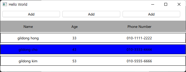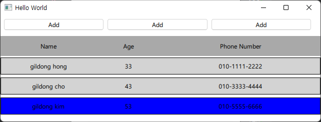 자 이제 실행해보면 선택한 행은 blue로 마우스가 행을 이동하면 선택되지 않은 행들은 lightGray에서 lightBlue로 User Interactive하게 변경된다.