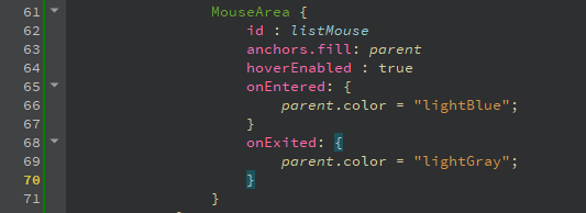 프로그램을 실행했을때 뭔가 그럴싸해 보이지만 데이터행을 선택하거나 마우스가 움직여도 반응이 없다. 마우스가 데이터행을 이동할때마다 뭔가 색상이 변경되어 반응하도록 해보자. delegate의 안쪽 Rectang 에서 MouseArea를 선언하고 마우스 움직임에 따른 색상을 지정한다. onEntered, onExited는 각각 마우스가 영역 안에 진입할때와 빠져 나올때 발생하는 이벤트들이다. hoverEnabled : true 도 잊지 말고 설정해두어야 한다. 기본값이 false여서 영역안에서 마우스의 움직임에 대해서 event가 발생하지 않게된다. 아마 필요없는경우 불필요한 부하는 줄이기 위한 방안인듯 싶다.