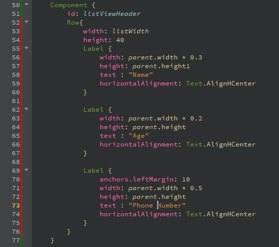 데이터행에서 ListModel에서 정의한 name, age, phoneNumber 를 model. 을 붙여서 표현하면 ListView가 model 프로퍼티에 연결된 ListModel의 순환하면서 ListElement의 key와 매칭되는 속성을 찾은뒤 값을 읽어 표시한다.