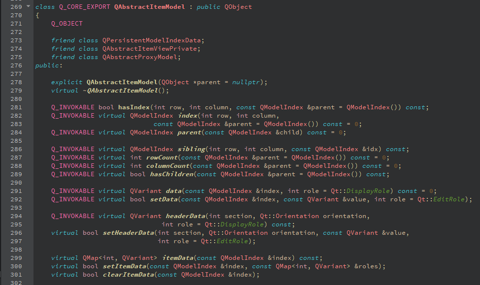 QT에서는 관련하여 QAbstractListMode, QAbstractTableModel 을 제공하는데 우리는 ListView에 연동할 리스트를 관리하는 모델임으로 QAbstractListModel을 상속받아서 작성한다. 먼저 QAbstractListModel 은 QAbstractItemModel을 상속받고 있는데 이것이 Table, Tree 를 위한 모델을 포함하여 부모클래스가 된다. 이 클래스에서 주요 가상함수들이 리스트 모델을 구성하는데 있어 중요 함수가 된다.