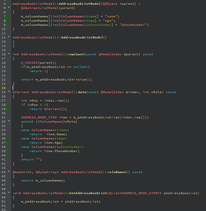 위에서 이야기한 몇개 함수만 재정의 하였다. 더불어 데이터의 각 row 정보를 담당하는 구조체도 정의하였다. enum 값으로 정의한 ColumnNames의 역할도 구현부에서 추가 설명할 것인데 이름을 보아도 알 수 있듯이 model에서 접근할 수 있는 컬럼명이 된다. 하단의 QList<ADDRES_BOOK_ITEM>은 포인터 형태로서 ViewModel을 통해 넘겨받아 QML 연동시켜 준다. 구현부는 아래와 같다.